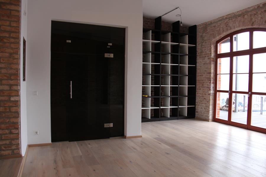 Glastrennwand aus Einscheibensicherheitsglas mit Edelstahlpunkthaltern